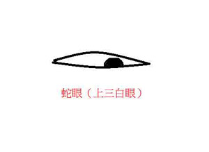 蛇眼,就是眼睛像蛇一樣,大家可以想像一下蛇的眼睛,又長又細,習慣瞪人狀態,眼球很少轉動之外,看人時不帶感情。蛇眼的人,眼珠常常向下,眼睛的左右上方都是眼白,因此又稱上三白眼。有此種眼的人,不仁不義不忠不孝,常常為非作歹。